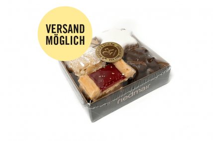 Enthaltene Sorten: Buttermandelgebäck, Heidesand, Linzergebäck, Honiglebkuchen hell, Vanillekipferl, Schokospitzbuben, Orangenmakrone, Schokomond, Spitzbuben, Duchess, Zimtsterne, Makronenstreifen, Herz rot